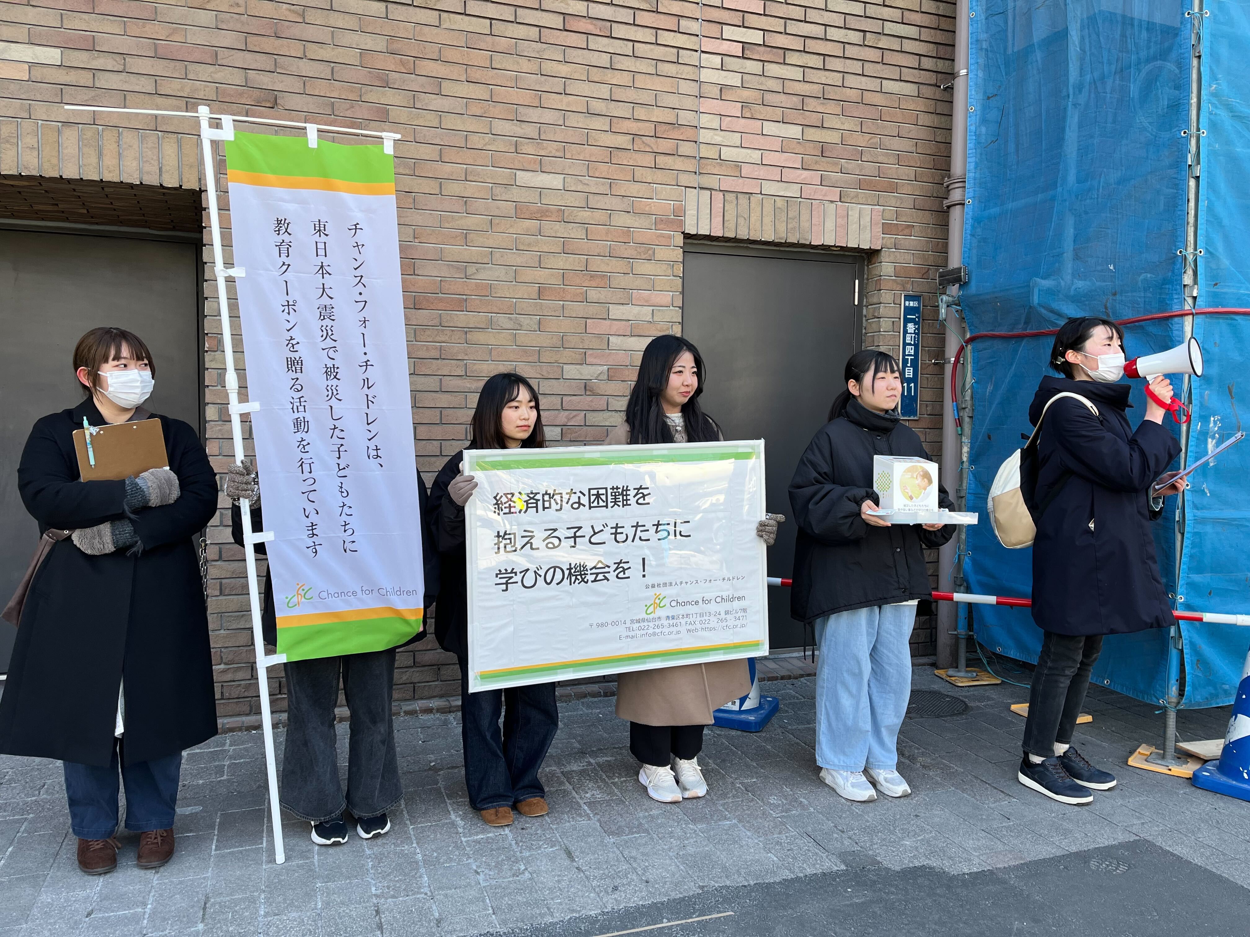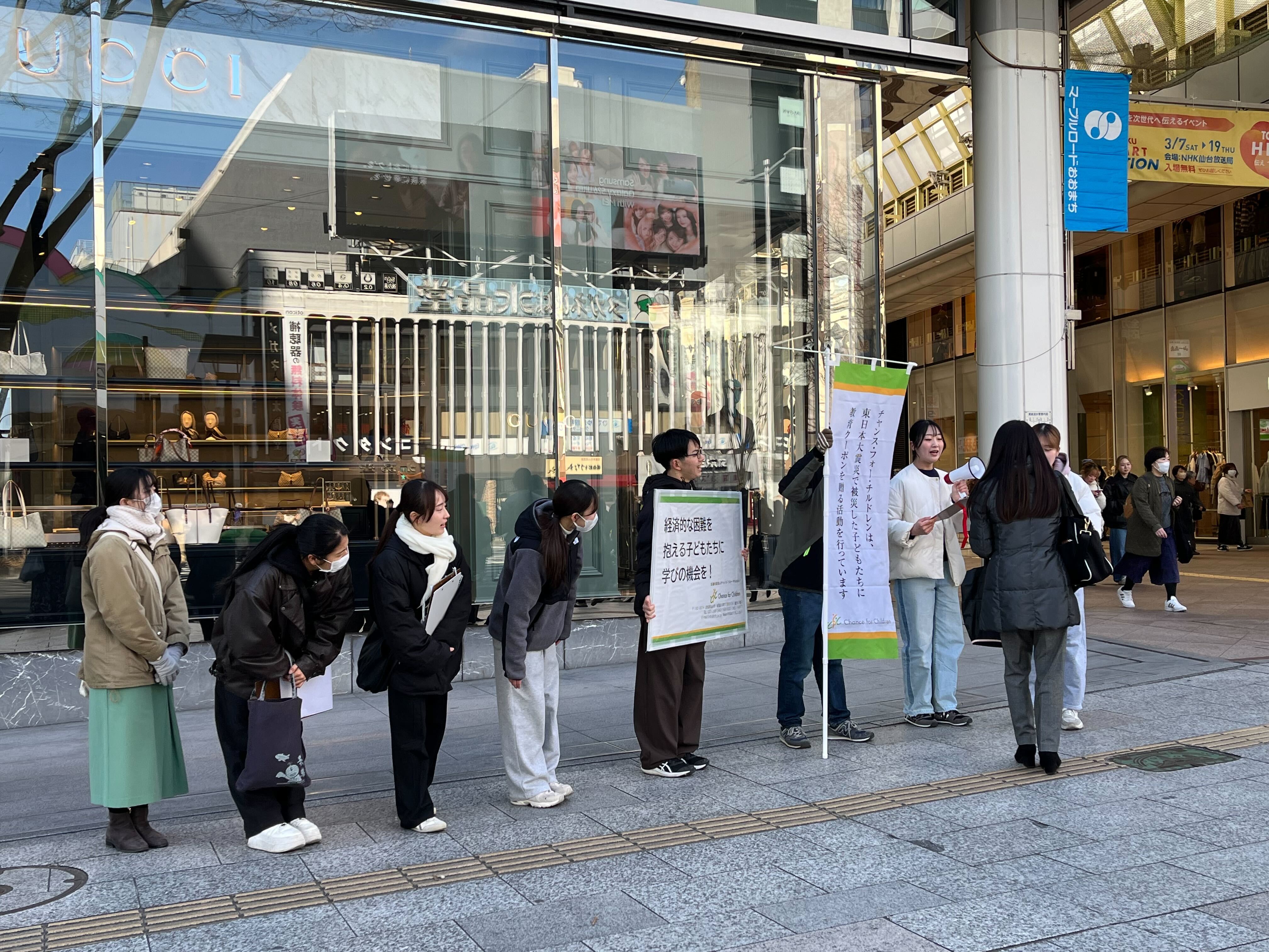 東日本大震災から15年を迎えた2026年3月11日、大学生ボランティアが中心となって、宮城県仙台市内で街頭募金活動を行いました。