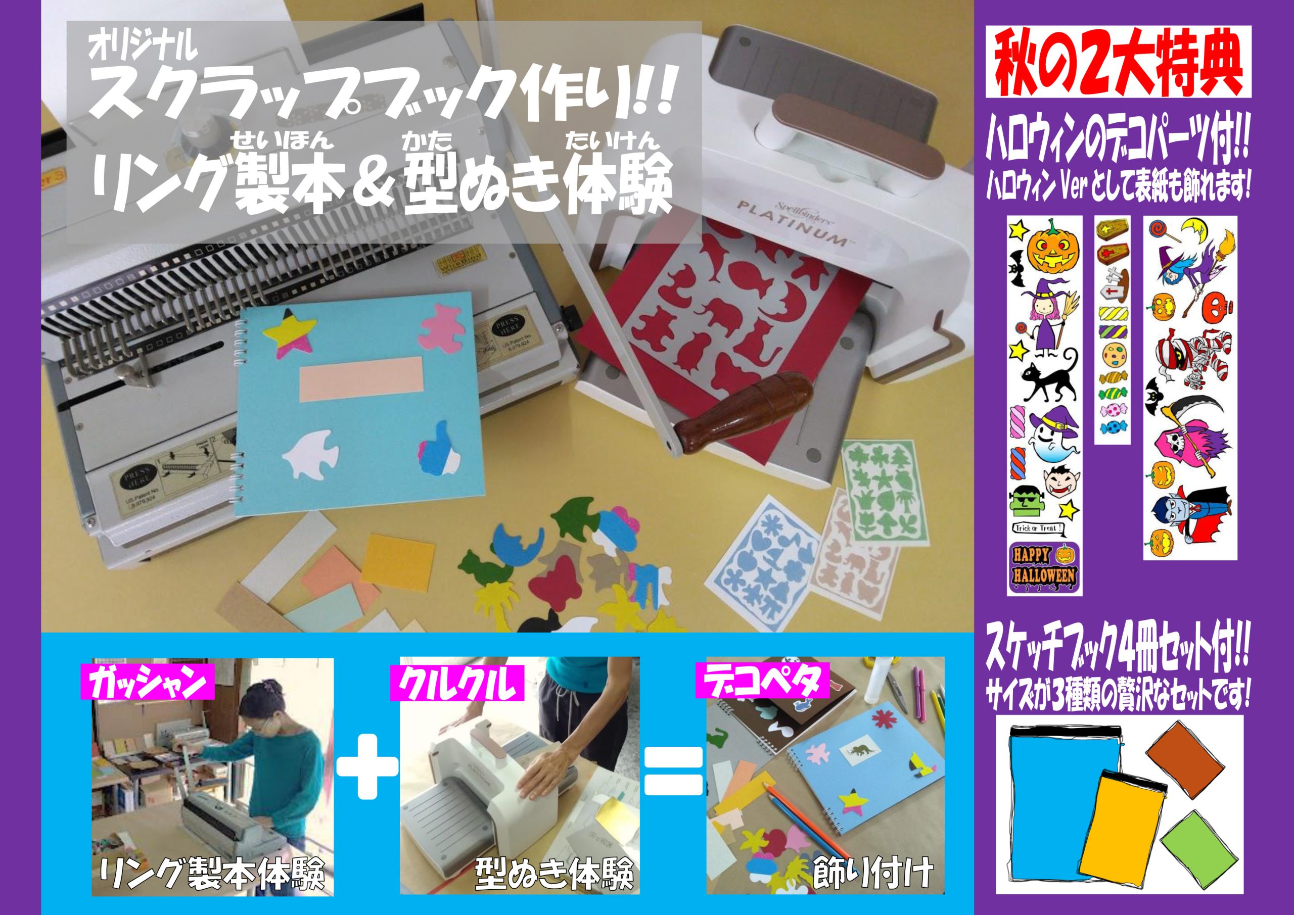 | 当日の活動内容 | 【リング製本】 (1)表紙、飛び出す遊び紙、中の紙、裏表紙を選ぶ。 (2)リングの穴をあけ、綴じて出来上がり。 【くるくるマシーンで型抜き】 (3)お好きな色紙と型抜き版を選ぶ。 (4)型を抜く。 (5)出来上がったスクラップブックに型抜きしたパーツで自由にデコレーション。 (6)完成したスクラップブックを見せびらかそう! 記念撮影もできます。 |